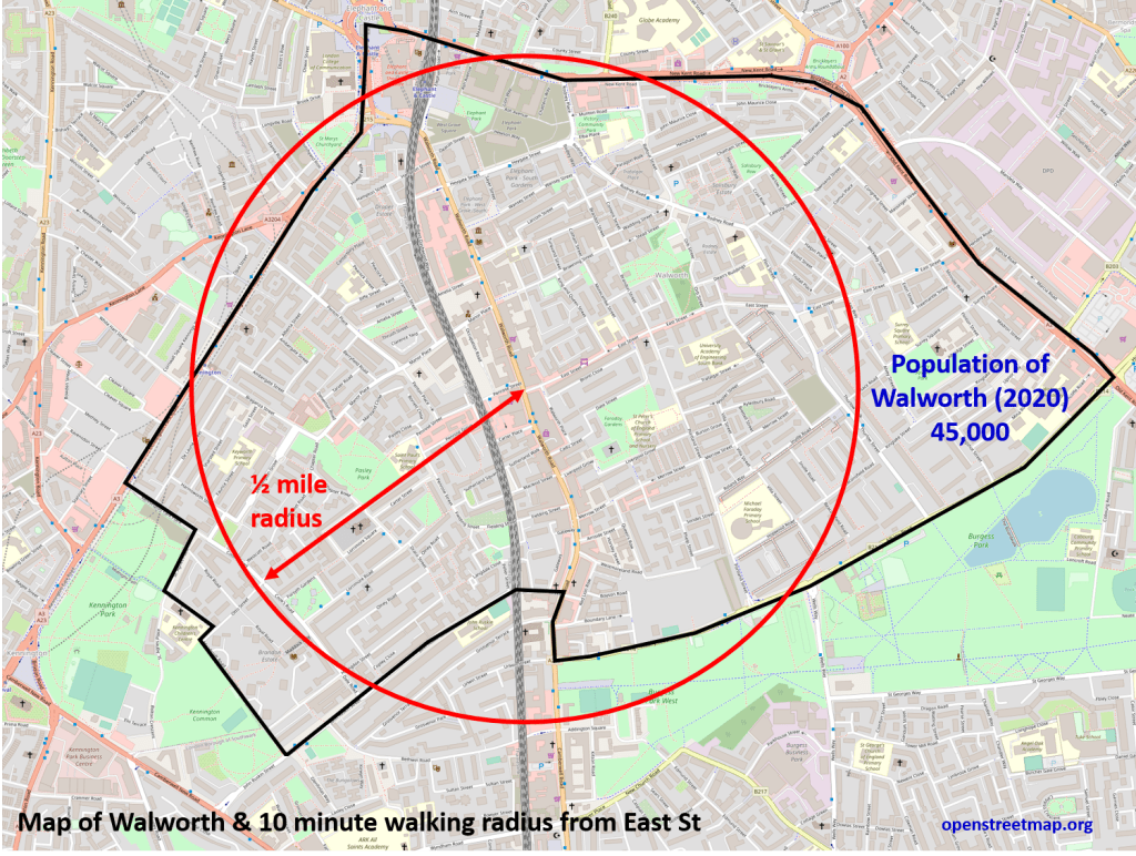 1. Densely populated. The Walworth area is densely populated with some 45,000 people living in the three local wards. Almost all of these are within a 10-minute (half mile) walk of the Walworth Road at its junction with Penrose St and East St, the historic village centre.