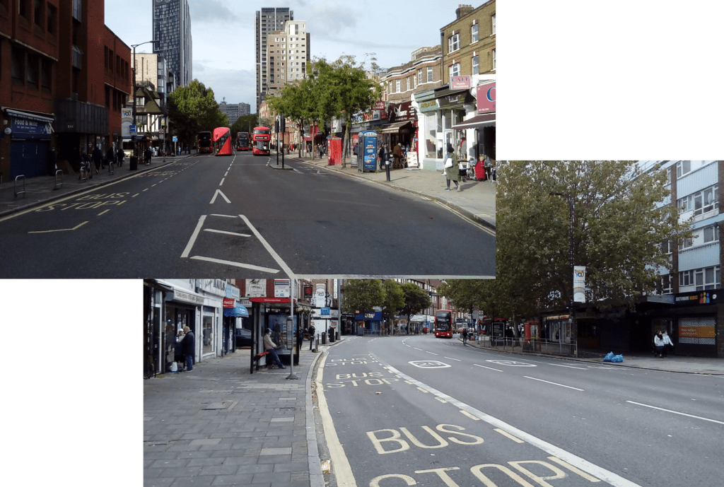 - Improving conditions on the high streets – traffic calming, frequent crossings, wide uncluttered pavements, protected cycle lanes, trees and greenery.