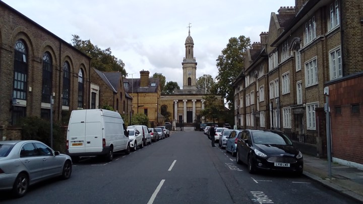 There are also roads that would benefit from (part) pedestrianisation and greening and rebalancing in favour of people. Here is the approach to Walworth’s only Grade 1 listed building, St Peter’s Church.